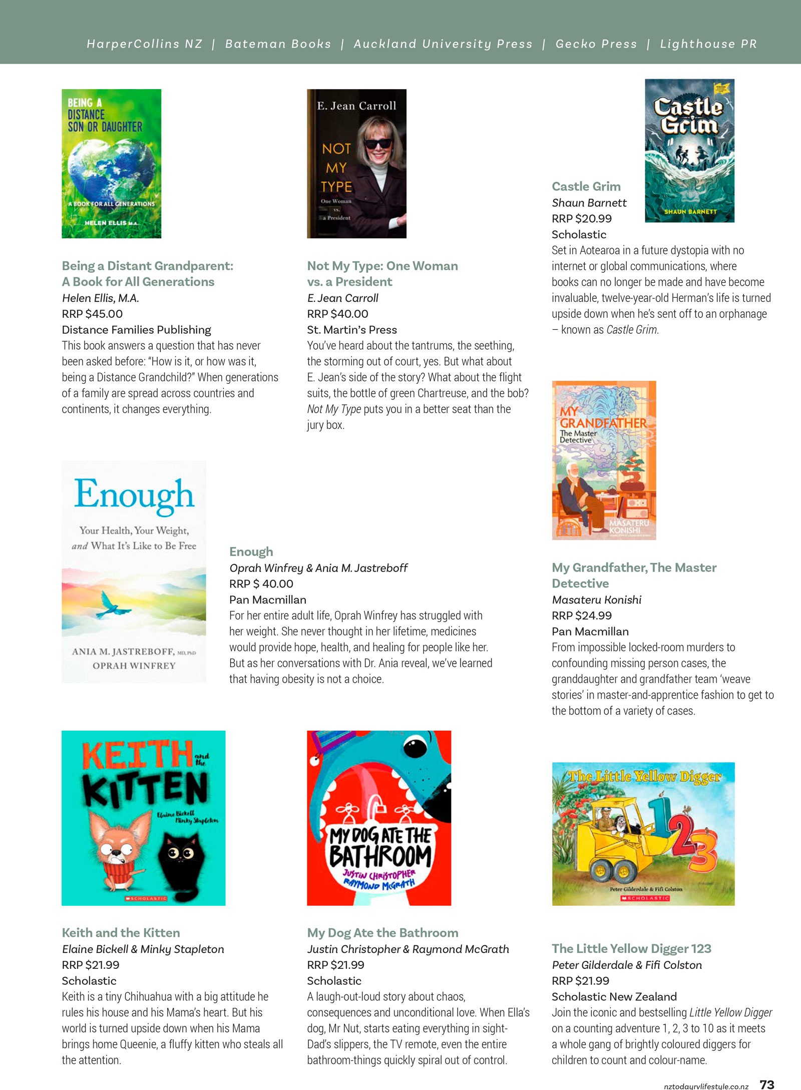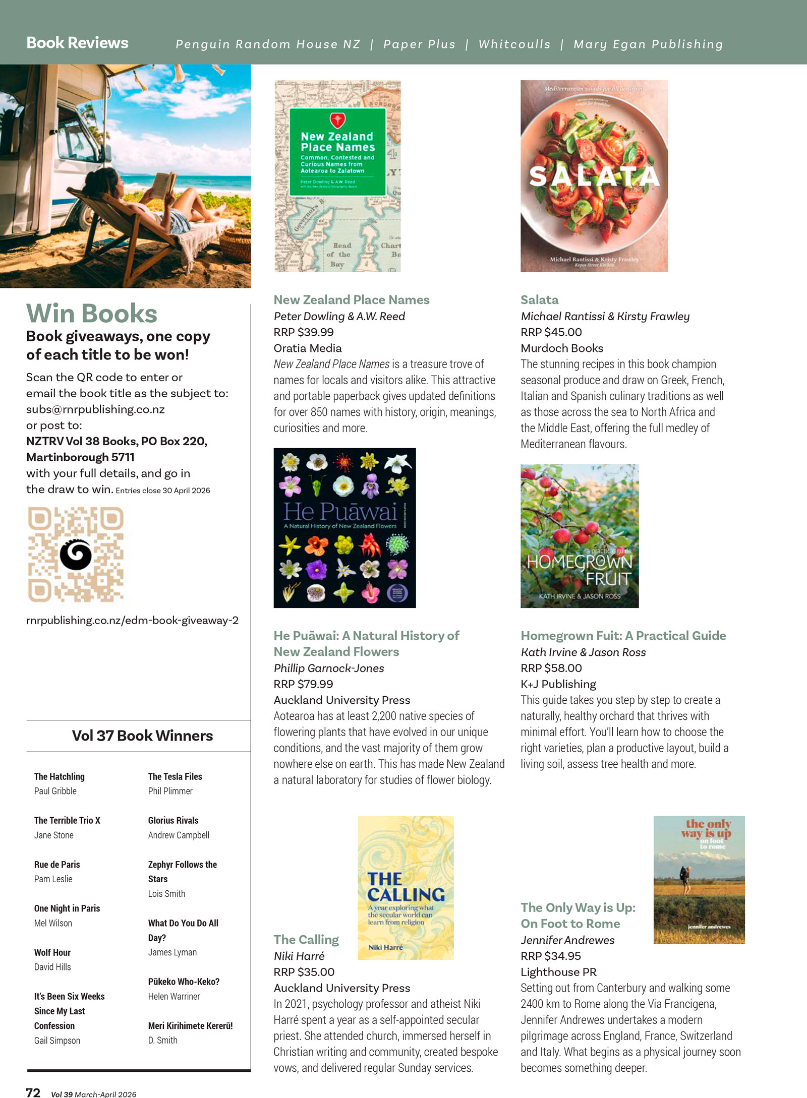 Book Giveaways December 5, 2021 / No Comments Book giveaways, one copy of each title to be won! Select your preferred book to receive*New Zealand Place Names by Peter Dowling & A.W. ReedHe Puāwai: A Natural History of New Zealand Flowers by Phillip Garnock-JonesThe Calling by Niki HarréSalata by Michael Rantissi & Kirsty FrawleyHomegrown Fuit: A Practical Guide by Kath Irvine & Jason RossThe Only Way is Up: On Foot to Rome by Jennifer AndrewesBeing a Distant Grandparent: A Book for All Generations by Helen Ellis, M.A.Enough by Oprah Winfrey & Ania M. JastreboffKeith and the Kitten by Elaine Bickell & Minky StapletonNot My Type: One Woman vs. a President by E. Jean CarrollMy Dog Ate the Bathroom Justin Christopher & Raymond McGrathCastle Grim by Shaun BarnettMy Grandfather, The Master Detective by Masateru KonishiThe Little Yellow Digger 123 by Peter Gilderdale & Fifi ColstonName* First Last Delivery Address* Street Address Address Line 2 City State / Province / Region ZIP / Postal Code AfghanistanAlbaniaAlgeriaAmerican SamoaAndorraAngolaAnguillaAntarcticaAntigua and BarbudaArgentinaArmeniaArubaAustraliaAustriaAzerbaijanBahamasBahrainBangladeshBarbadosBelarusBelgiumBelizeBeninBermudaBhutanBoliviaBonaire, Sint Eustatius and SabaBosnia and HerzegovinaBotswanaBouvet IslandBrazilBritish Indian Ocean TerritoryBrunei DarussalamBulgariaBurkina FasoBurundiCabo VerdeCambodiaCameroonCanadaCayman IslandsCentral African RepublicChadChileChinaChristmas IslandCocos IslandsColombiaComorosCongoCongo, Democratic Republic of theCook IslandsCosta RicaCroatiaCubaCuraçaoCyprusCzechiaCôte d'IvoireDenmarkDjiboutiDominicaDominican RepublicEcuadorEgyptEl SalvadorEquatorial GuineaEritreaEstoniaEswatiniEthiopiaFalkland IslandsFaroe IslandsFijiFinlandFranceFrench GuianaFrench PolynesiaFrench Southern TerritoriesGabonGambiaGeorgiaGermanyGhanaGibraltarGreeceGreenlandGrenadaGuadeloupeGuamGuatemalaGuernseyGuineaGuinea-BissauGuyanaHaitiHeard Island and McDonald IslandsHoly SeeHondurasHong KongHungaryIcelandIndiaIndonesiaIranIraqIrelandIsle of ManIsraelItalyJamaicaJapanJerseyJordanKazakhstanKenyaKiribatiKorea, Democratic People's Republic ofKorea, Republic ofKuwaitKyrgyzstanLao People's Democratic RepublicLatviaLebanonLesothoLiberiaLibyaLiechtensteinLithuaniaLuxembourgMacaoMadagascarMalawiMalaysiaMaldivesMaliMaltaMarshall IslandsMartiniqueMauritaniaMauritiusMayotteMexicoMicronesiaMoldovaMonacoMongoliaMontenegroMontserratMoroccoMozambiqueMyanmarNamibiaNauruNepalNetherlandsNew CaledoniaNew ZealandNicaraguaNigerNigeriaNiueNorfolk IslandNorth MacedoniaNorthern Mariana IslandsNorwayOmanPakistanPalauPalestine, State ofPanamaPapua New GuineaParaguayPeruPhilippinesPitcairnPolandPortugalPuerto RicoQatarRomaniaRussian FederationRwandaRéunionSaint BarthélemySaint Helena, Ascension and Tristan da CunhaSaint Kitts and NevisSaint LuciaSaint MartinSaint Pierre and MiquelonSaint Vincent and the GrenadinesSamoaSan MarinoSao Tome and PrincipeSaudi ArabiaSenegalSerbiaSeychellesSierra LeoneSingaporeSint MaartenSlovakiaSloveniaSolomon IslandsSomaliaSouth AfricaSouth Georgia and the South Sandwich IslandsSouth SudanSpainSri LankaSudanSurinameSvalbard and Jan MayenSwedenSwitzerlandSyria Arab RepublicTaiwanTajikistanTanzania, the United Republic ofThailandTimor-LesteTogoTokelauTongaTrinidad and TobagoTunisiaTurkmenistanTurks and Caicos IslandsTuvaluTürkiyeUS Minor Outlying IslandsUgandaUkraineUnited Arab EmiratesUnited KingdomUnited StatesUruguayUzbekistanVanuatuVenezuelaViet NamVirgin Islands, BritishVirgin Islands, U.S.Wallis and FutunaWestern SaharaYemenZambiaZimbabweÅland Islands Country PhoneEmail* CommentsThis field is for validation purposes and should be left unchanged. Δ No comments
