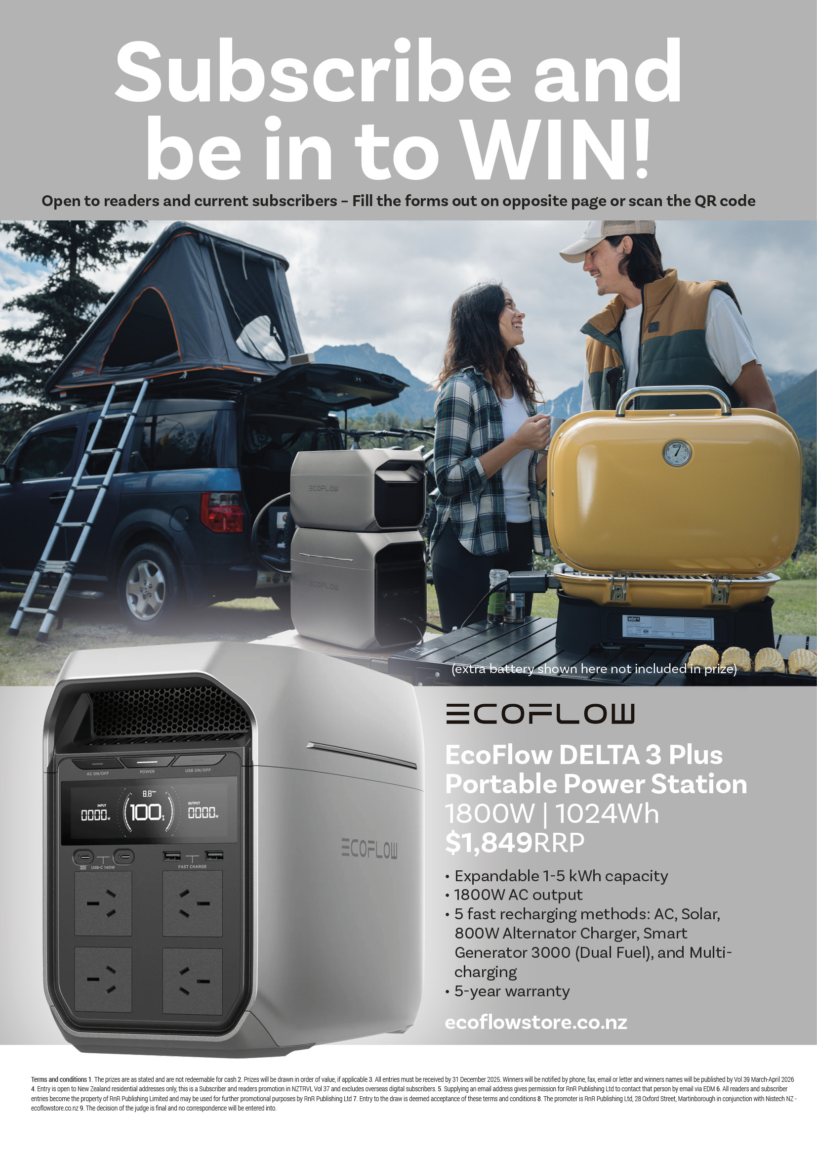 Subscribe & be in to win a EcoFlow DELTA 3 Plus Portable Power Station October 14, 2025 / No Comments *Closes 31 December 2025. The magazines are to be sent...* Within New Zealand To Australia Outside New Zealand & Australia New Zealand Subscription - OptionsPhysical (6 issues) - $77.70Physical + Digital (6 issues) - $89.70Physical + Digital (3 issues) - $45Single Digital issue - $3Digatal (6 issues) - $12 SAVE $6Please choose the subscription length you'd prefer.NZMCA Membership # from your NZMCA CardMAC Code from your NZMCA CardI want to start the subscription with...*the issue currently in the shops.the next issue to be published.Your Email Address* Please enter your email address. We'll send you confirmation of your subscription.Subscriber Details - where we send the magazines.Subscriber Full Name* First Last Enter the first and last name of the person to receive the magazines.Subscriber's Email Address If the subscriber does not have an email address, please just put your own one.Subscriber's Phone Number*Please enter the subscriber's phone number.Subscriber's Address* Street Address Address Line 2 City State / Province / Region ZIP / Postal Code AfghanistanAlbaniaAlgeriaAmerican SamoaAndorraAngolaAnguillaAntarcticaAntigua and BarbudaArgentinaArmeniaArubaAustraliaAustriaAzerbaijanBahamasBahrainBangladeshBarbadosBelarusBelgiumBelizeBeninBermudaBhutanBoliviaBonaire, Sint Eustatius and SabaBosnia and HerzegovinaBotswanaBouvet IslandBrazilBritish Indian Ocean TerritoryBrunei DarussalamBulgariaBurkina FasoBurundiCabo VerdeCambodiaCameroonCanadaCayman IslandsCentral African RepublicChadChileChinaChristmas IslandCocos IslandsColombiaComorosCongoCongo, Democratic Republic of theCook IslandsCosta RicaCroatiaCubaCuraçaoCyprusCzechiaCôte d'IvoireDenmarkDjiboutiDominicaDominican RepublicEcuadorEgyptEl SalvadorEquatorial GuineaEritreaEstoniaEswatiniEthiopiaFalkland IslandsFaroe IslandsFijiFinlandFranceFrench GuianaFrench PolynesiaFrench Southern TerritoriesGabonGambiaGeorgiaGermanyGhanaGibraltarGreeceGreenlandGrenadaGuadeloupeGuamGuatemalaGuernseyGuineaGuinea-BissauGuyanaHaitiHeard Island and McDonald IslandsHoly SeeHondurasHong KongHungaryIcelandIndiaIndonesiaIranIraqIrelandIsle of ManIsraelItalyJamaicaJapanJerseyJordanKazakhstanKenyaKiribatiKorea, Democratic People's Republic ofKorea, Republic ofKuwaitKyrgyzstanLao People's Democratic RepublicLatviaLebanonLesothoLiberiaLibyaLiechtensteinLithuaniaLuxembourgMacaoMadagascarMalawiMalaysiaMaldivesMaliMaltaMarshall IslandsMartiniqueMauritaniaMauritiusMayotteMexicoMicronesiaMoldovaMonacoMongoliaMontenegroMontserratMoroccoMozambiqueMyanmarNamibiaNauruNepalNetherlandsNew CaledoniaNew ZealandNicaraguaNigerNigeriaNiueNorfolk IslandNorth MacedoniaNorthern Mariana IslandsNorwayOmanPakistanPalauPalestine, State ofPanamaPapua New GuineaParaguayPeruPhilippinesPitcairnPolandPortugalPuerto RicoQatarRomaniaRussian FederationRwandaRéunionSaint BarthélemySaint Helena, Ascension and Tristan da CunhaSaint Kitts and NevisSaint LuciaSaint MartinSaint Pierre and MiquelonSaint Vincent and the GrenadinesSamoaSan MarinoSao Tome and PrincipeSaudi ArabiaSenegalSerbiaSeychellesSierra LeoneSingaporeSint MaartenSlovakiaSloveniaSolomon IslandsSomaliaSouth AfricaSouth Georgia and the South Sandwich IslandsSouth SudanSpainSri LankaSudanSurinameSvalbard and Jan MayenSwedenSwitzerlandSyria Arab RepublicTaiwanTajikistanTanzania, the United Republic ofThailandTimor-LesteTogoTokelauTongaTrinidad and TobagoTunisiaTurkmenistanTurks and Caicos IslandsTuvaluTürkiyeUS Minor Outlying IslandsUgandaUkraineUnited Arab EmiratesUnited KingdomUnited StatesUruguayUzbekistanVanuatuVenezuelaViet NamVirgin Islands, BritishVirgin Islands, U.S.Wallis and FutunaWestern SaharaYemenZambiaZimbabweÅland Islands Country Please enter the address where we will send the magazines.Is this the Renewal of an existing subscription?* Yes No Client ID (if known)Is this a gift subscription for another person?* Yes No Your DetailsPlease enter your own details if this is a gift subscription for someone else, as you indicated above.Your Name* First Last Please enter your first name and surname.Your Address* Street Address Address Line 2 City State / Province / Region ZIP / Postal Code AfghanistanAlbaniaAlgeriaAmerican SamoaAndorraAngolaAnguillaAntarcticaAntigua and BarbudaArgentinaArmeniaArubaAustraliaAustriaAzerbaijanBahamasBahrainBangladeshBarbadosBelarusBelgiumBelizeBeninBermudaBhutanBoliviaBonaire, Sint Eustatius and SabaBosnia and HerzegovinaBotswanaBouvet IslandBrazilBritish Indian Ocean TerritoryBrunei DarussalamBulgariaBurkina FasoBurundiCabo VerdeCambodiaCameroonCanadaCayman IslandsCentral African RepublicChadChileChinaChristmas IslandCocos IslandsColombiaComorosCongoCongo, Democratic Republic of theCook IslandsCosta RicaCroatiaCubaCuraçaoCyprusCzechiaCôte d'IvoireDenmarkDjiboutiDominicaDominican RepublicEcuadorEgyptEl SalvadorEquatorial GuineaEritreaEstoniaEswatiniEthiopiaFalkland IslandsFaroe IslandsFijiFinlandFranceFrench GuianaFrench PolynesiaFrench Southern TerritoriesGabonGambiaGeorgiaGermanyGhanaGibraltarGreeceGreenlandGrenadaGuadeloupeGuamGuatemalaGuernseyGuineaGuinea-BissauGuyanaHaitiHeard Island and McDonald IslandsHoly SeeHondurasHong KongHungaryIcelandIndiaIndonesiaIranIraqIrelandIsle of ManIsraelItalyJamaicaJapanJerseyJordanKazakhstanKenyaKiribatiKorea, Democratic People's Republic ofKorea, Republic ofKuwaitKyrgyzstanLao People's Democratic RepublicLatviaLebanonLesothoLiberiaLibyaLiechtensteinLithuaniaLuxembourgMacaoMadagascarMalawiMalaysiaMaldivesMaliMaltaMarshall IslandsMartiniqueMauritaniaMauritiusMayotteMexicoMicronesiaMoldovaMonacoMongoliaMontenegroMontserratMoroccoMozambiqueMyanmarNamibiaNauruNepalNetherlandsNew CaledoniaNew ZealandNicaraguaNigerNigeriaNiueNorfolk IslandNorth MacedoniaNorthern Mariana IslandsNorwayOmanPakistanPalauPalestine, State ofPanamaPapua New GuineaParaguayPeruPhilippinesPitcairnPolandPortugalPuerto RicoQatarRomaniaRussian FederationRwandaRéunionSaint Barthélem